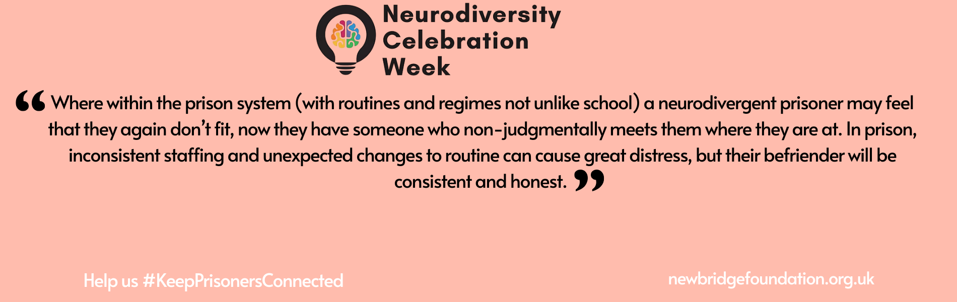 A bit of background to my interest in neurodiversity in prisons. Firstly, when I became a school support assistant, my first pupil was an enthusiastic and energetic boy aged 9, diagnosed ADHD and autistic. I knew virtually nothing about neurodivergence then, about 10 years ago, so I got a book and read up about ADHD. One fact stayed with me, about how much more likely an individual with ADHD is to get caught up in the Criminal Justice System. Impulsivity and challenges with focus can lead to difficulties with following rules and self-esteem can take a huge knock. Seeing that young boy before me it was hard to hear. Data now suggests that at least half of the prison population is neurodivergent. Recently diagnosed autistic myself and volunteering for New Bridge for a year now, I have been researching and reflecting on imprisonment and the befriending relationship through a neurodivergent lens.